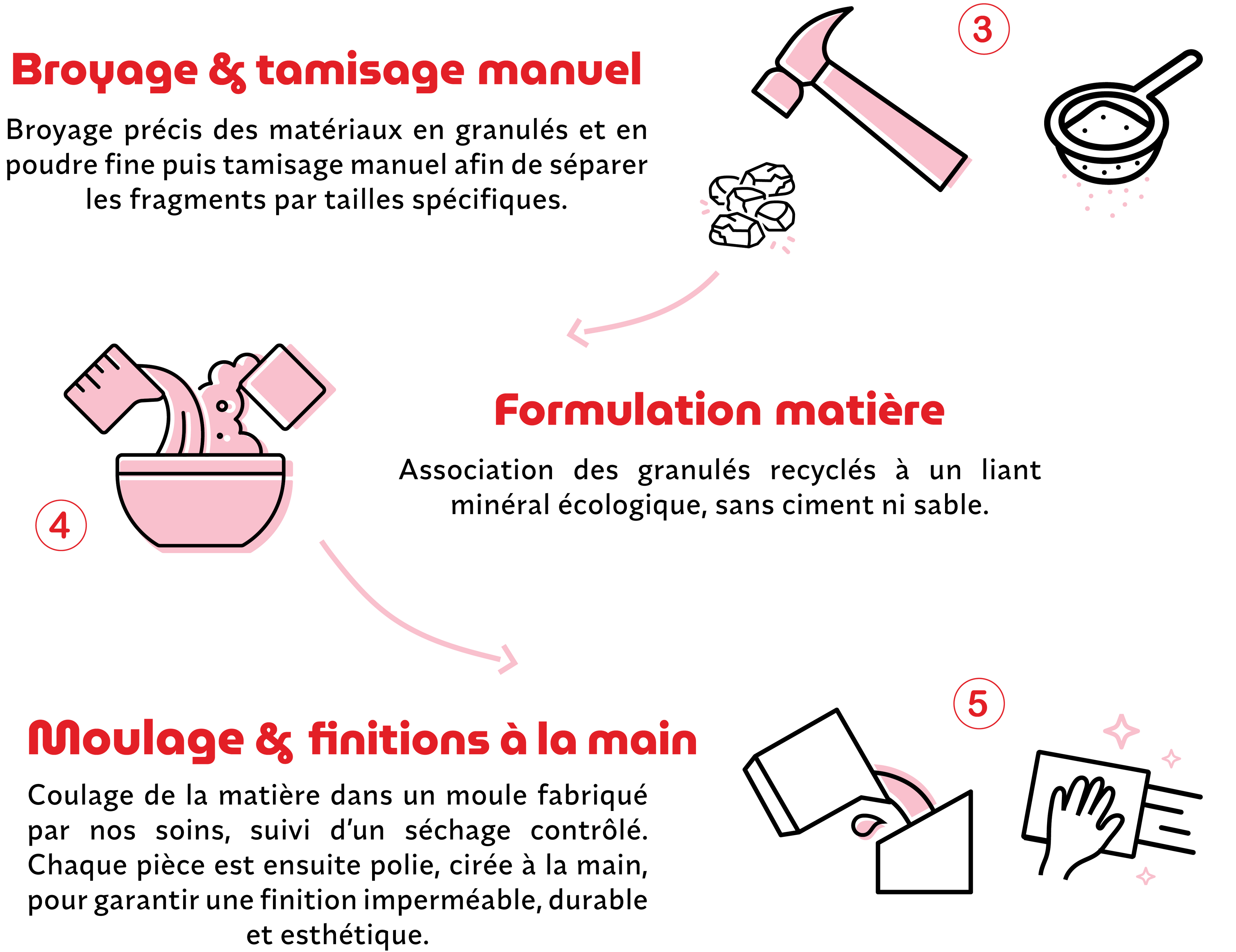 Grâce à notre processus, chaque pièce est entièrement personnalisable. Vous pouvez choisir la composition du terrazzo, la matière première, la couleur, la texture, le filament assorti, offrant ainsi une infinité de combinaisons possibles.